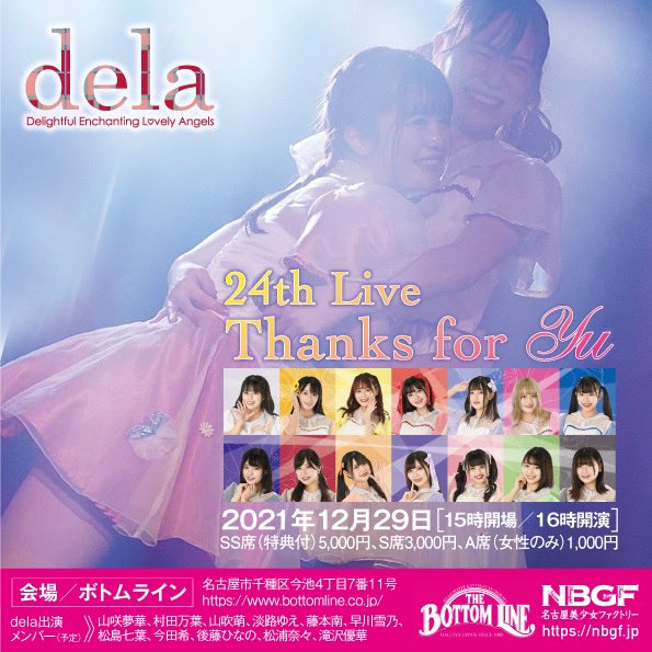 dela 24th Live「Thanks fou Yu」 【日時】2021年12月29日(水)開場 15:00 / 開演 16:00(新型コロナウイルス感染対策のため、開演時間は変更する場合があります。) 【会場】ボト…