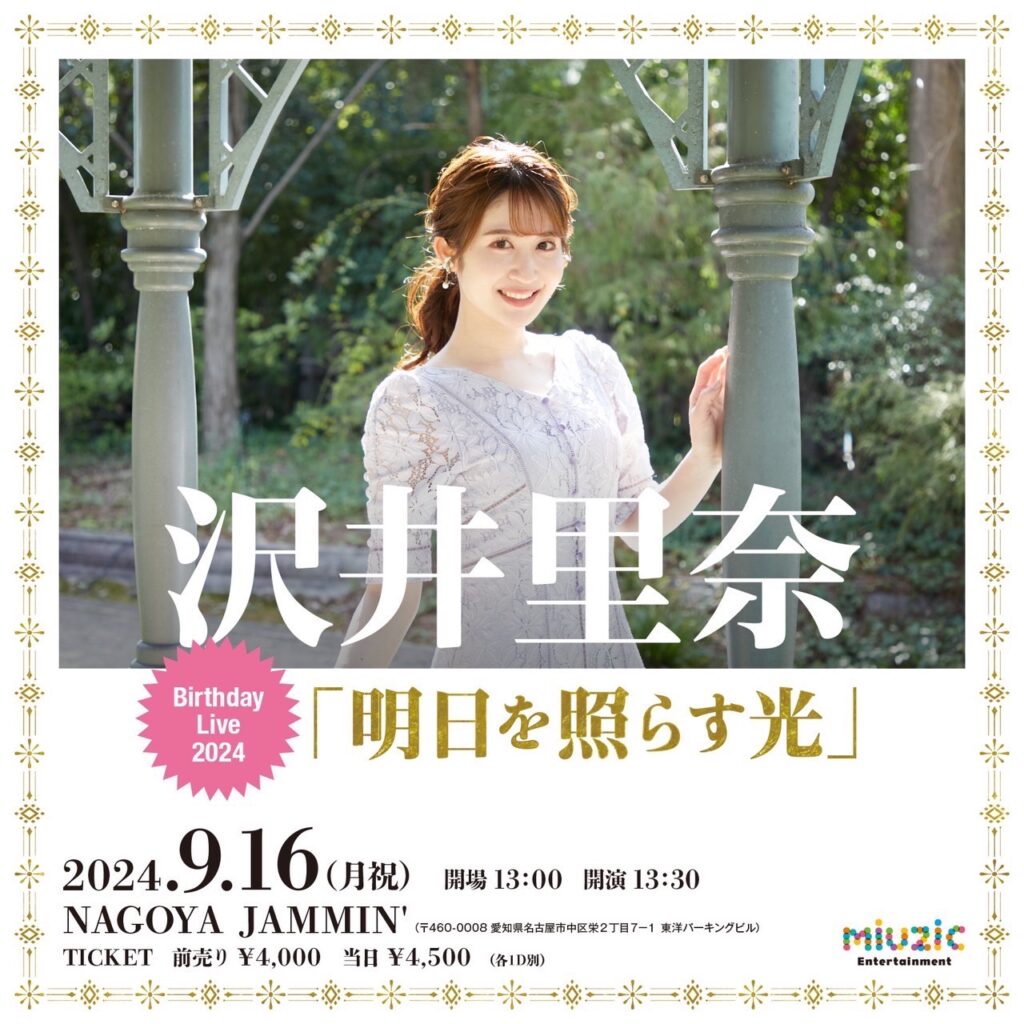 沢井里奈 Birthday Live 2024「明日を照らす光」 【日時】2024年9月16日(月祝)開場13:00 / 開演13:30 【会場】NAGOYA JAMMIN’(〒460-0008 愛知県名古屋…